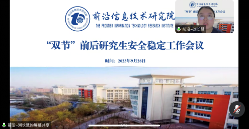 首先,副院长潘恒祝贺大家节日快乐,并强调在节日期间要注意安全,及时向导师汇报行踪。其次,刘长慧对“双节”前后留校、离返校等注意事项做了详细的讲解。接着,刘建美强调国庆节、中秋节期间禁止参加非法集会,享受与家人团聚的时光。最后潘恒再次祝贺大家节日快乐,注意出行安全。