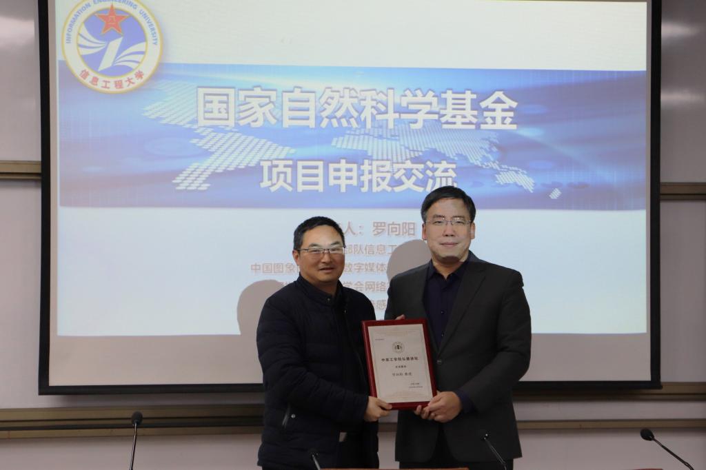 12月24日,应我校科技处和前沿信息技术研究院邀请,解放军信息工程大学罗向阳教授为我校青年教师作了题为《新时代信息技术的机遇与挑战——国家自然科学基金申报方法交流》的讲座。讲座开始前,科技处处长宋晓炜为罗向阳颁发了“弘德讲坛”主讲证书,讲座由科技处副处长郑慧凡主持。
