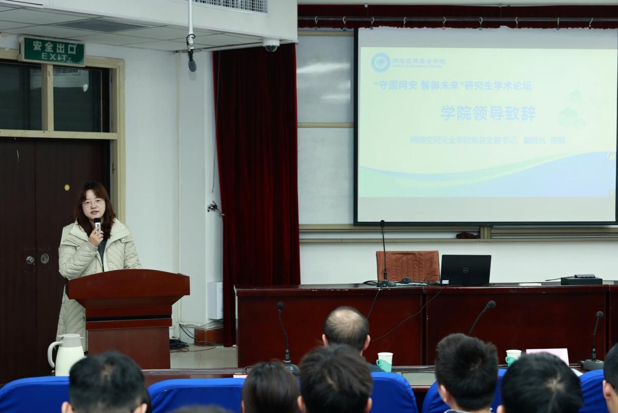 邢颖在致辞中讲到,学术进步源于思想碰撞,创新火花来自观点交融。网络安全事关国家发展、社会稳定,是 “守” 与 “进” 的持续探索。希望同学们珍惜机会,以开放心态倾听多元见解,在交流中启迪思路、在切磋中补齐短板。期待本次论坛播撒创新火种,激励青年学子在守护网络安全的征程中勇担使命、智创未来!