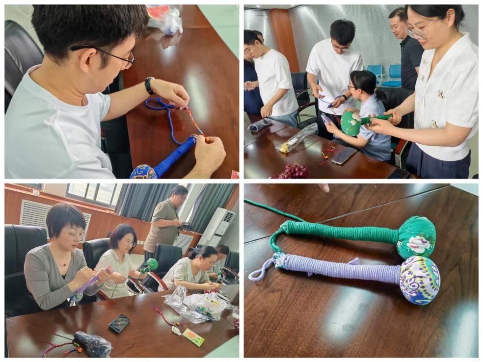 手工制作艾草按摩锤区域同样热闹非凡。教职工们围坐在一起,认真观看讲解视频,随后便迫不及待地动手操作起来。填充艾草、捆扎绳结,一个个精致的艾草按摩锤在教职工们的巧手下逐渐诞生。在这个过程中,大家互相交流制作经验,分享彼此的创意与想法,现场充满了温馨与和谐的氛围。通过亲手制作艾草按摩锤,教职工们不仅体验到了传统手工艺的乐趣,更感受到了传统文化的独特魅力。