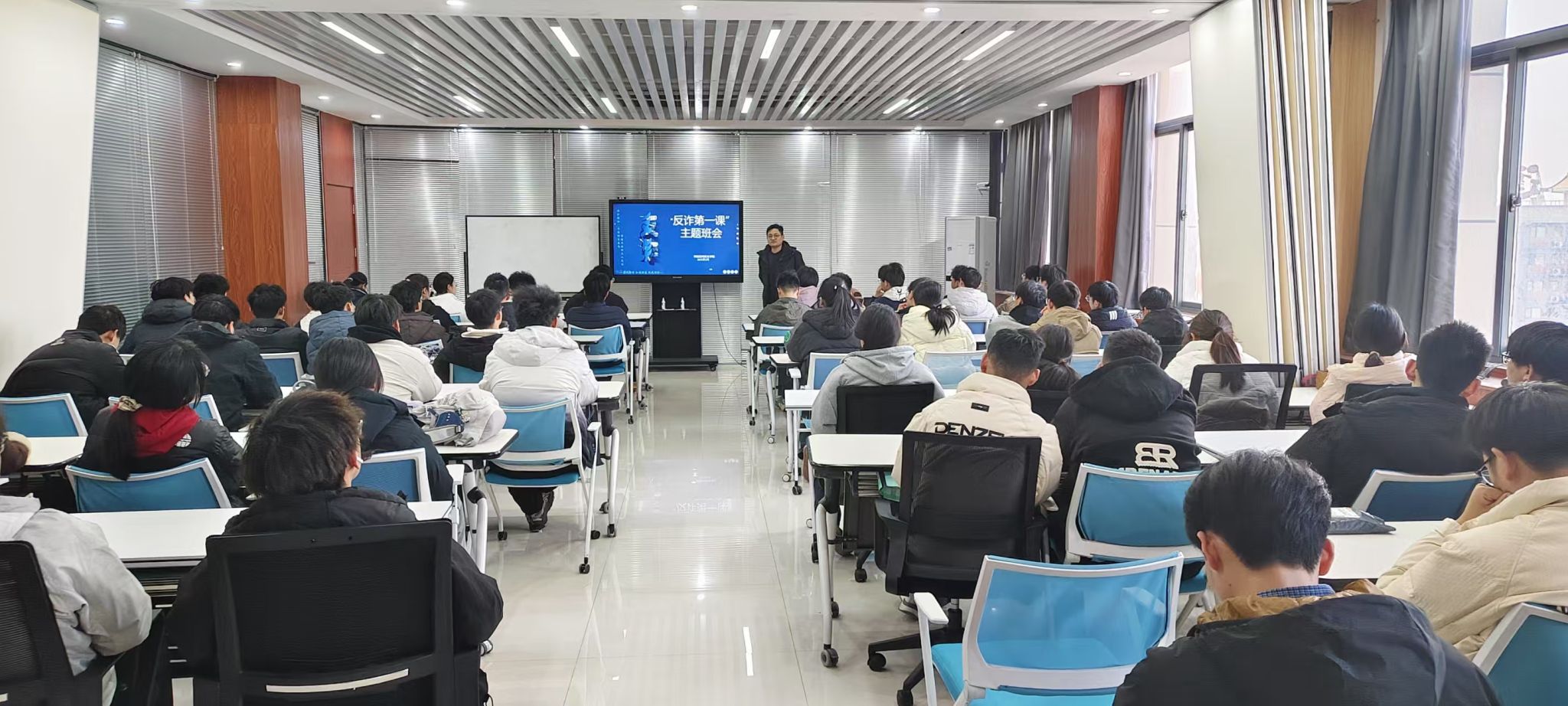 为提高学生防范电信网络诈骗的意识和能力,筑牢校园反诈“防火墙”,williamhill英国中文于2月25日在三号组团楼A1208教室召开“反诈第一课”主题班会。会议由班主任张龙老师主持,全体本科生参加。