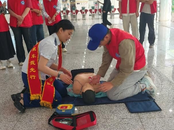活动伊始,志愿者在工作人员指导下学习了电梯故障响应机制和紧急制动按钮操作,以及地铁门防夹联动装置的应急操作规范,并通过情景模拟学习了乘客安全疏导技巧。并特别设置急救技能专项培训,工作人员采用"理论讲解+人体模型实操"方式,系统传授AED设备操作要领,志愿者全员通过心肺复苏模拟考核,初步具备基础急救能力。在实践环节,志愿者整理了站外非机动车乱停现象,协助维护交通秩序,发放《地铁出行防骗指南》,普及网络购票安全知识,并指导老年乘客安装官方反诈APP。