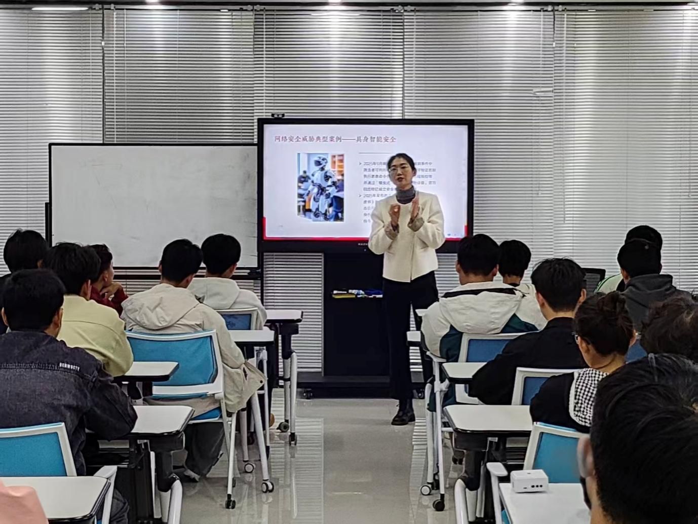 潘恒以“矢志担当,做网络空间守护新生力量”为主题,围绕四个方向展开讲授:在“专业认知”环节,她深入阐释了新时代网安人肩负的使命与行业发展的重大机遇;在“学院概览”部分,她系统介绍了学院的发展历程、师资队伍与专业特色,彰显学院雄厚实力;围绕“成长路径”,她为同学们规划大学阶段的发展方向提供具体建议,助力其行稳致远;最后,在“寄语展望”中,她勉励全体新生珍惜青春时光,勇担网安责任,成为可堪大用、能担重任的时代新人